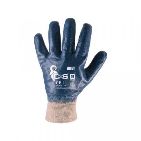 Povrstvené pracovní rukavice s pružným nápletem na zápěstí. Vrstva nitrilu pokrývá dlaň, prsty i hřbet ruky.Bavlněné rukavice CXS máčené v nitrilu, modré/bílé