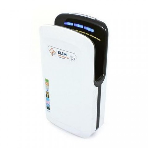 Bezdotykové elektrické vysoušeče rukou Jet Dryer Slim jsou nejmenší vysoušeče z řady Jet Dryer. Díky svým malým rozměrům nezabírají moc místa a je možné je použít i do menších prostor. Vnitřní vysoušecí prostor je osvětlený úspornými LED diodami. Tryskové vysoušeče SLIM nabízejí výběr ze dvou rychlostí sušení. Na nižší stupeň je jejich provoz velmi tichý, na vyšším stupni trvá vysoušení kratší dobu. Provoz vysoušečů je zcela bezkontaktní. Nasávaný vzduch je filtrovaný přes HEPA filtr. Efektivní doba sušení: 10 - 15 s. Rychlost proudění vzduchu: 85 - 105 m/s. Objem odkapové nádoby: 1000 ml.Bezdotykové elektrické vysoušeče rukou Jet Dryer Slim