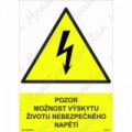 Tabulky, značky a samolepky "Pozor! Možnost výskytu životu nebezpečného napětí " jsou tištěny na vysoce kvalitním materiálu, barvami s vysokou odolností proti otěru a UV záření. Provedení je plně v souladu s požadavky právních a technických předpisů, zejména Nařízení vlády č. 375/2017 Sb., ČSN ISO 3864-1, ČSN ISO 3864-2, ČSN ISO 3864-3, ČSN ISO 3864-4. Symbol bezpečnostní tabulky s textem „Pozor možnost výskytu životu nebezpečného napětí“.Výstražné tabulky - Pozor možnost výskytu životu nebezpečného napětí