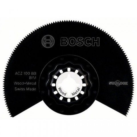 Hodí se pro veškeré nářadí Starlock (Bosch: GOP 12V-28 Professional; PMF 220 CE; PMF 250 CES), StarlockPlus (Bosch: GOP 30-28; GOP 40-30; GOP 18V-28 Professional; PMF 350 CES - Fein: AFMT 12 SL; AFMT 12 QSL; AFMM 18 QSL; FMT 250 SL; FMT 250 QSL; FMM 350 QSL) a StarlockMax (Bosch: GOP 55-36 Professional - Fein: AFSC 18 QSL; AFSC 18 QCSL; FSC 500 QSL). Nářadí Bosch OIS GOP a PMF; Fein Multimaster a Multitalent; AEG; Einhell; Hitachi; Makita; Metabo; Milwaukee; Ryobi; Skil atd. ACZ 100 BB. BIM segmentový pilový kotouč Starlock Wood and Metal, profilovaný. Zkrácení dveřní zárubně u podlahy (měkké dřevo, tvrdé dřevo, dýhované desky, laminované desky). Vyřezání laminátu/parket (např.?pro montáž příčky). Zkracování menších profilových lišt (např.?hliníkových podlahových lišt) balení: 1 x BAL, 10ks v BAL; 1 x BAL, 1ks v BAL materiál: BIMBosch - BIM segmentové pilové kotouče Starlock ACZ 100 BB Wood and Metal