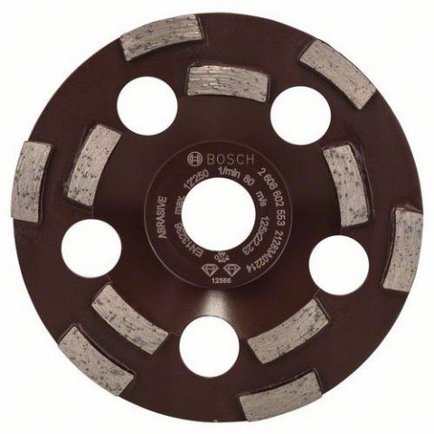 Optimalizovaný kotouč na vápennou omítku a potěrový beton. Tvrdé kovové pojivo odolá i zátěži při broušení abrazivních materiálů. Hodí se pro velkoplošný úběr abrazivních materiálů, jako je vápenná omítka, potěr (podklad podlahy), pískovec nebo velmi abrazivní beton - nehodí se pro broušení tvrdých materiálů. Pájené segmenty. Dvě řady segmentů pro rovné obroušení. Maximální nevyváženost 50 g*mm pro práci bez vibrací balení: 1 x BAL, 1ks v BAL o otvoru hřídele: 22,23 mm nevyváženost, max. g*mm: 50 o: 125 mm tloušťka čepele: 4,5 mmBosch - Diamantový hrncový kotouč Expert for Abrasive 125 x 22,23 x 4,5 mm