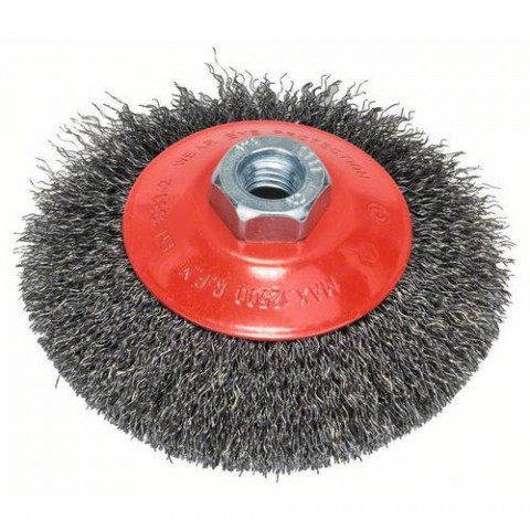 Kuželový kartáč - zvlněné dráty. Optimálně se hodí pro opracování špatně přístupných míst (díky kónickému tvaru kartáče). Hodí se pro lehké až středně těžké čisticí práce při vysokých obvodových rychlostech na menších kovových plochách balení: 1 x BAL, 1ks v BAL závit: M 14 o: 100; 115 mm max. rychlost: 12500 ot/min o kabelu: 0,3; 0,35 mmBosch - Kuželový ocelové kartáče pro úhlové brusky a přímé brusky