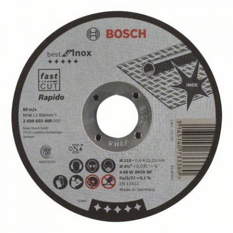 Řezné kotouče na nerezovou ocel (Inox) špičkové třídy pro nejvyšší nároky. Hodí se pro ručně vedené úhlové brusky. Max. obvodová rychlost: 80 m/s (v závislosti na otáčkách a průměru kotouče). balení: 25 x BAL, 1ks v BAL o otvoru hřídele: 22,23 mm o: 115; 125; 230 mm tloušťka: 0,8; 1; 1,9 mm model: A 46 V INOX BF; A 60 W INOX BFBosch - Řezné kotouče na nerezovou ocel, rovné Best for Inox - Rapido