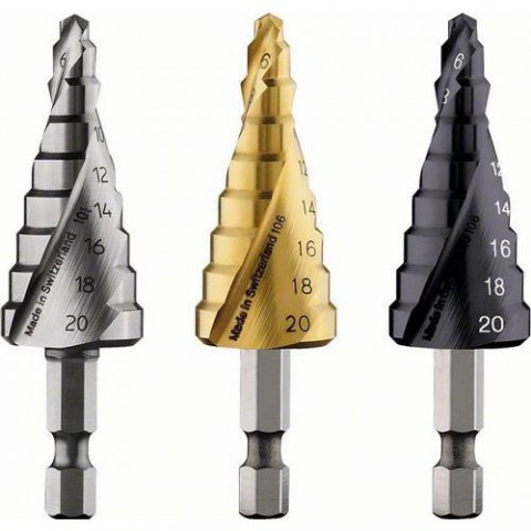 Vhodné pro téměř všechny tenké materiály, např. neželezné kovy, ocelové plechy, plasty nebo nerezovou ocel. Bez předvrtávání, bez otřepů do tenkých plechů. pro odstraňování otřepů, kruhové otvory, vrtání více průměrů jedním vrtákem, navrtávání stávajících otvorů. Spirálová drážka pro delší životnost, menší vibrace a rychlejší postup vrtání. Vyznačení průměru na obou spirálách. Stopka se 3 ploškami proti prokluzování ve sklíčidle. Dostupné ve třech provedeních:HSS = 100% životnostHSS-TiN = 125% životnostHSS-AlTiN = 150% životnost (není nutné chlazení) balení: 1 x BAL, 1ks v BAL výška stupně: 4 mm typ: HSS; HSS-AlTiN; HSS-TiN délka: 70,5 mm o vrtáku: 4-20 mmBosch - Stupňovitý vrták, šestihranná stopka