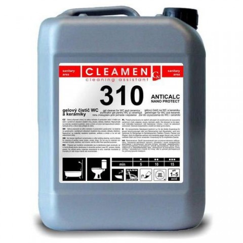 CLEAMEN 310 na toalety 5l, antibakteriální je určen na odstranění vodního kamene, močových a dalších minerálních usazenin z vnitřních částí WC mís, pisoárů, umyvadel a dalšího sanitárního vybavení. Prostředek se používá neředěný, nanese se na vnitřní stěnu WC mísy a nechá se stékat, případně se rozetře štětkou aby byl rozprostřen po celém povrchu. Dále se nechá volně působit cca 5-10 min. Po této době se nanesený prostředek spláchne při současném použití WC štětky, aby došlo k odstranění veškerých nečistot.Je vhodné používat štětku s kartáčkem, který dosáhne pod převislý okraj WC mísy, kde se často drží nečistoty. Nenechávejte nanesený prostředek dlouhodobě působit (více jak 20 minut), v případě velmi silné souvislé vrstvy usazeného vodního kamene je vhodnější proces ukončit a mechanickým působením narušit tuto vrstvu, při opakovaném procesu dojde k jejímu rychlejšímu rozpuštění.Cleamen 310 na WC a keramiku antibakteriální 5l