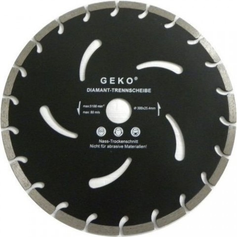 Kvalitní diamantový segmentový řezný kotouč GEKO s rozměry 300 x 25,4 x 10 mm vhodný pro hluboké řezání tvrdých stavebních materiálů za mokra i za sucha. S přerušovaným diamantovým segmentem po celém obvodu (s drážkami, výřezy), který je rozdělený na určitý počet užších segmentů. Tyto výřezy kotouč během řezání chladí a vynáší obroušený materiál z řezu ven. Segmentový kotouč se hodí pro hluboké řezání tvrdých stavebních materiálů jako je např. beton, železobeton, asfalt, zdivo, kámen apod., vytváří širší řez a může štípat okraje.Diamantový řezný kotouč, segmentový, 300x25,4x10mm GEKO