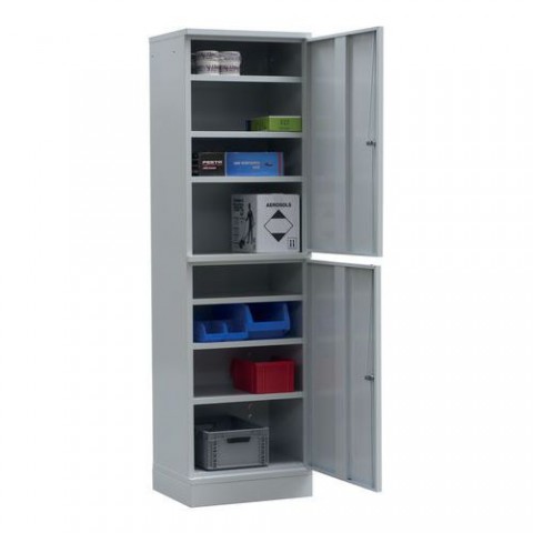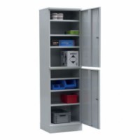 Dílenská skříň vhodná pro uložení pracovních nástrojů a pomůcek. Skříň je rozdělena na dvě části z nichž každá je uzamykatelná pomocí visacího zámku. Uvnitř je nářaďová skříň vybavena šesti policemi, které nabízejí výškovou přestavitelnost. Skříň je vyrobena z ocelového plechu.Dílenská skříň na nářadí, 205 x 59 x 44 cm
