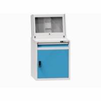 Uzamykatelná dílenská skříň určená pro bezpečné umístění počítačového vybavení v provozních místnostech. Skříň je rozdělena do tří samostatně uzavíraných částí, vrchní díl je opatřen sklopnými uzamykatelnými dvířky s posuvným držákem pro monitor. Součástí je výsuvná police pro klávesnici. Rozměry spodní skříně 750 x 725 x 589 mm. Zásuvky ve standardu E vhodné pro klienty z CZ, SK a PL.Dílenská skříň pro PC, 149,5 x 75,3 x 73,1 cm