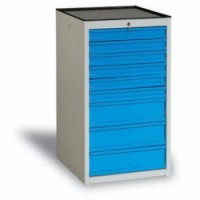 Zásuvková dílenská skříň je vybavena devíti zásuvkami s kuličkovým výsuvem, kde první dvě jsou včetně kovových děličů usnadňujících orientaci, děliče lze dokoupit do dalších čtyř zásuvek výšky 6,3 cm. Skříňka na nářadí je centrálně uzamykatelná pomocí cylindrického zámku.Dílenská zásuvková skříň, 108 x 59 x 62 cm, 9 zásuvek