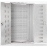 Zadní stěna s perforací pro zavěšení plastových boxů a vnitřní strany dveří pro uchycení držáků nářadí. Robustní svařovaná ocelová konstrukce s nosností až 1,5 tuny, povrchová úprava práškovým lakem. Vyztužené křídlové dveře, uzamykání cylindrickým zámkem se dvěma klíči. Držáky nářadí nejsou součástí dodávky.Dílenské skříně s perfo panely pro držáky na boxy/nářadí