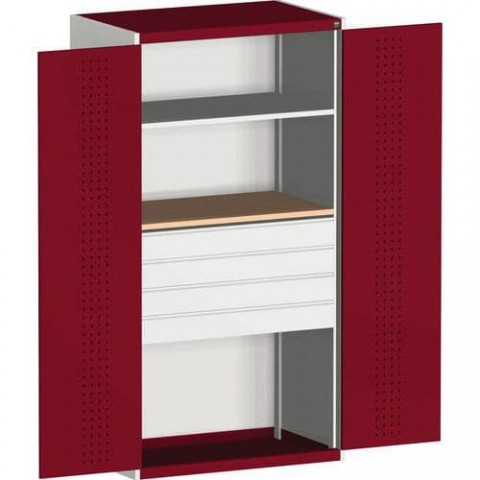 Kovové dílenské skříně vybaveny policemi s nosností 160 kg pro efektivní využití v provozech a dílnách. Varianty se zásuvkami mají zásuvky s nosností 75 kg a 100% výsuvem na válečkových ložiskách. Zadní část skříní a vnitřní část dveří jsou opatřeny perforovanými panely pro uchycení držáků nářadí. Robustní svařovaná ocelová konstrukce s nosností až 1,5 tuny, povrchová úprava práškovým lakem. Vyztužené křídlové dveře, uzamykání cylindrickým zámkem se dvěma klíči. Pozinkované police výškově nastavitelné v rastru 25 mm. Součástí je pracovní deska tloušťky 2,5 cm multiplex vysoce odolná proti vlhkosti.Dílenské skříně se zásuvkami Bott Cubio 160, multiplex, výška 200 cm