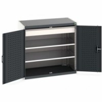 Kovové dílenské skříně vybaveny policemi s nosností 100 kg a zásuvkami pro efektivní využití v provozech a dílnách. Robustní svařovaná ocelová konstrukce s nosností až 1,5 tuny, povrchová úprava práškovým lakem. Vyztužené křídlové dveře s perforovanou vnitřní stranou pro uložení nářadí. Tříbodový cylindrický rozvorový zámek se dvěma klíči. Pozinkované police výškově nastavitelné v rastru 25 mm. Zásuvky s nosností 75 kg a 100% výsuvem na válečkových ložiskách.Dílenské skříně se zásuvkami Bott Cubio, výška 100 cm