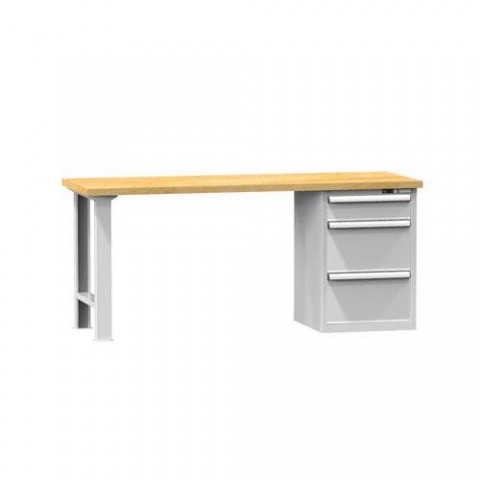 Dílenské stoly Kombi se třemi zásuvkami. Vysoce kvalitní robustní pracovní deska o šířce 200 cm a síle 40 mm je z bukových hranolů průběžně lepených do tvaru desky a následně broušená a ošetřená roztokem lněného oleje s přísadami. Zásuvková skříň se třemi zásuvkami je opatřená mechanismem centrálního zamykání a blokace zásuvek. Standardně jsou skříně osazeny cylindrickými zámky, ke každému zámku jsou dodávány dva klíče. Dostupné ve třech barevných variantách (modrá, tmavě modrá, šedá). Pracovní prostor lze rozšířit díky nástavbě pracovního stolu a širokému příslušenství. Nosnost stolu je 700 kg.Dílenské stoly Kombi, 88 x 200 x 70 cm, 3 zásuvky, buk