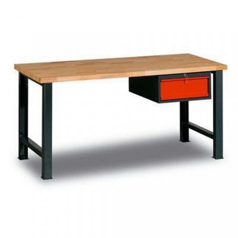 Dílenský stůl Weld ve dvou barevných variantách složený z pracovní desky, pevného podnoží a zásuvky. Stůl je stabilní a vyhovuje i náročnějším pracovním úkolům díky robustnímu provedení podnoží a vyšší váze bukové spárovky. Pracovní deska 170 x 68,5 cm z bukové spárovky tl. 4 cm, sražené hrany, bez povrchové úpravy. Maximální nosnost pracovní desky při rovnoměrném zatížení 500 kg. Svařovaná zásuvka v x š x h: 18 x 51 x 59 cm, výsuv 100%, kuličková ložiska pojezdů. Zásuvka uzamykatelná cylindrickým zámkem se dvěma klíči. Pevné podnoží z ocelového U - profilu 50 x 70 cm, tl. 3mm a ocelových plechů tl. 0,8 mm. Otvory v pracovní desce pro montáž podnoží nebo skříněk nutno předvrtat vrtákem pr. 4 - 4,5 mm (pro vrtání zvolte taková místa, kde se vyhnete spojům jednotlivých lamel stolu). Desku doporučujeme impregnovat speciálním olejem, především pokud je stůl umístěn ve vlhkém prostředí. Povrchová úprava kovových částí práškovým lakem.Dílenské stoly Weld, 84 x 170 x 68,5 cm
