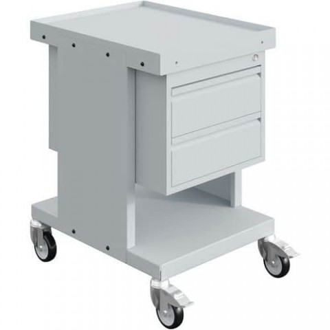 Robustní ocelový vozík s policemi. Povrchová úprava epoxidovým lakem. Snadná manipulace díky polotuhým polymerovým obručím kol.Dílenské vozíky na materiál Sofame, 2 patra, 2 zásuvky, 150 kg