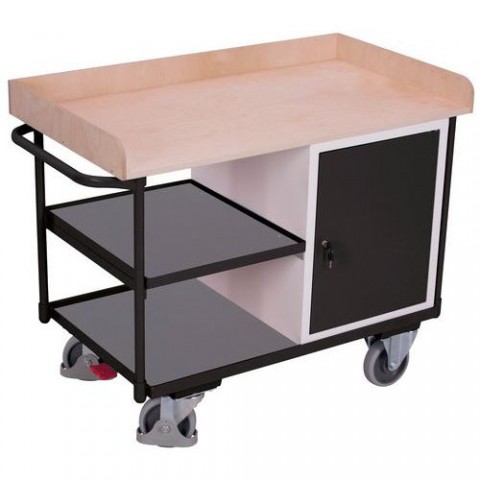 Dílenský vozík je vybaven uzamykatelnou skříňkou, uvnitř které se nachází dvě vyndavací police. Police pod pracovní deskou je vyrobena z MDF materiálu. Ložná plocha je ohraničena třístranným dřevěným rámem s osmicentimetrovým okrajem. Mobilitu dílenského vozíku zajišťují dvě pevná a dvě otočná pryžová kola s brzdou.Dílenské vozíky se skříňkou, 95,5 x 122 x 64 cm