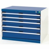 Zásuvkové skříně Bott Cubio se zásuvkami s nosností 75 kg a 100% výsuvy na válečkových ložiskách. Robustní svařovaná ocelová konstrukce s nosností až 1,5 tuny, povrchová úprava práškovým lakem. Systém centrálního zámku i blokace otevření více zásuvek najednou. Ergonomické rukojeti s popisovatelnou lištou, uzamykání cylindrickým zámkem se dvěma klíči.Dílenské zásuvkové skříně Bott Cubio, 60 x 80 x 52,5-75 cm, 5 zásuvek