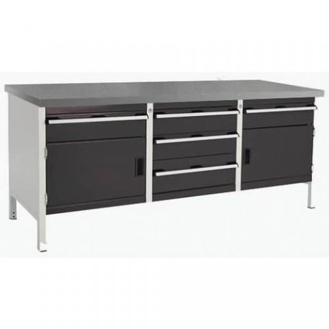 Dílenské stoly Bott Cubio Storage s pracovní deskou tloušťky 4 cm typu multiplex nebo linoleum. Nosnost až 800 kg, robustní svařovaná ocelová konstrukce, povrchová úprava práškovým lakem. Centrálně uzamykatelné zásuvky s výškou 4 x 15 a 1 x 20 cm, s nosností 75 kg a 100% výsuvem na válečkových ložiskách. Uzamykatelé skříňky s výškou dveří 35 cm, uvnitř pozinkovaná výškově nastavitelná police s nosností 100 kg.Dílenský stůl Bott Cubio Storage, 84 x 200 x 75 cm, 2 skříňky, 5 zásuvek, multiplex/linoleum