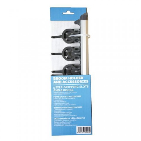 Nástěnný držák na úklidové pomůcky a smetáky. Vybavený 5 háčky a 6 otvory na rukojeti smetáků nebo mopů. Vyrobený z kombinace hliníku a plastu. Dodáváno včetně montážního materiálu.Držák na smetáky a úklidové pomůcky Manutan Expert, 5 háčků