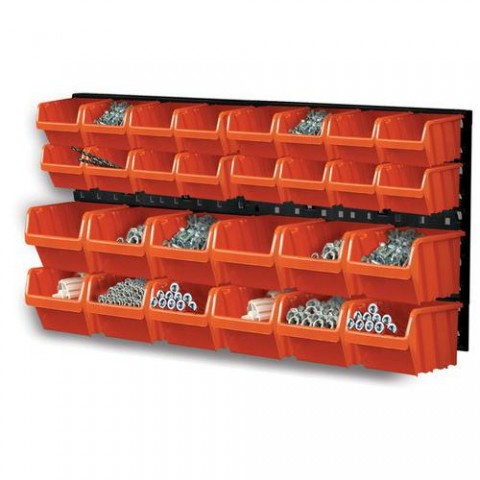 Víceúčelová tabule na nářadí k zavěšení na stěně.  Snadná montáž nádobek na tabuli dovoluje jejich jednoduché přemisťování. Kdykoliv můžete nádobku sundat a lehce se dostat k obsahu. Díky držákům, které jsou součástí sady, najde své využití v garáži nebo dílně a svoje nářadí budete mít vždy po ruce. Snadná montáž nádobek na tabuli dovoluje jejich jednoduché přemisťování.Ekobox plastový, sada 28 boxů, 2 panely, 800 x 195 x 400 mm