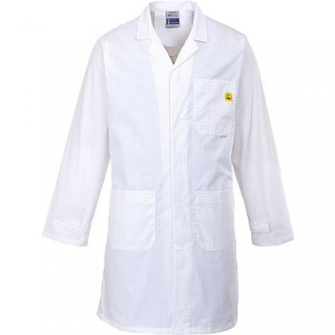Antistatický pracovní oděv pro ESD pracovní prostředí. Bezpečný oděv skrytá přední část dvě spodní kapsy jedna kapsa na hrudi a nastavitelné manžety. CE certifikace ESD Kapsa na mobilní telefon UPF 50+ Nastavitelné manžety na suchý zip 3 kapsyESD antistatický plášť, bílá