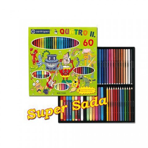 Šedesátikusová souprava pro malé výtvarníky. Obsahuje 30ks vypratelných fixů, 7ks přebarvitelných značkovačů a 1 zmizík. Kromě toho ještě 6ks značkovačů s reflexním inkoustem, 12ks pastelek a čtvery omalovánky.Fix CENTROPEN sada 9396 QUATRO