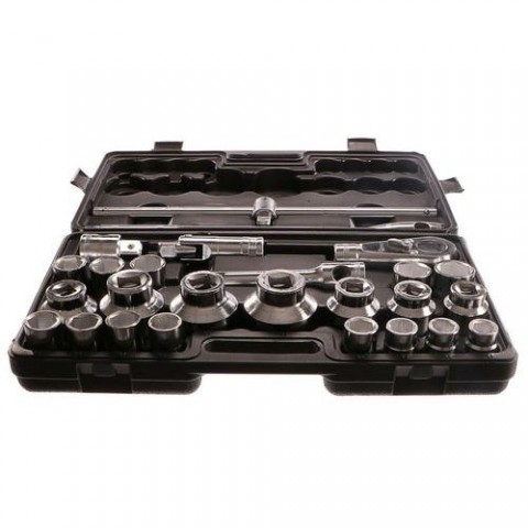 Dílenská gola sada osazená hlavicemi ve velikosti 3/4 v počtu 26 ks. Hlavice1": 55, 60 a 65 mm. Hlavice 3/4": 21, 22, 23, 24, 26, 27, 28, 29, 30, 31, 32, 34, 36, 38, 41, 46 a 50 mm. Ráčna 3/4". Přechodka 3/4". Knoflík 3/4". Průchodka 1". 2 prodloužení 3/4". V plastovém kufru.Gola sada, 26ks, 3/4", GEKO