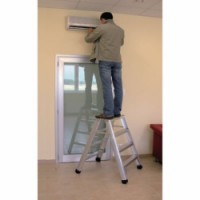 Skládací oboustranné schůdky vhodné pro profesionální použití. Protiskluzový rýhovaných povrch stuňů, vzdálenost mezi stupni je 22 cm. Opatřené ochrannými patkami.Hliníkové schůdky Patron s plošinou, oboustranné, 2 x 4 stupně