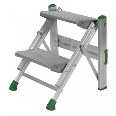 Skládací schůdky vhodné pro práci v průmyslu, ve skladech nebo obchodech. Protiskluzový rýhovaný povrch stupňů, vzdálenost mezi stupni je 24 cm. Opatřené ochrannými protiskluzovými patkami.Hliníkové schůdky ROBUST, 2 stupně