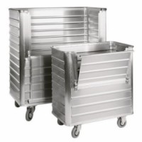 Hliníkový přepravní vozík s objemem 1 050 l a se stabilními zesílenými žebrovanými stěnami. Vozík je odolný vůči korozi, je lehký a snadno udržovatelný. Pohyb zajišťují dvě otočná a dvě pevná kola.Hliníkový přepravní vozík, 1050 l