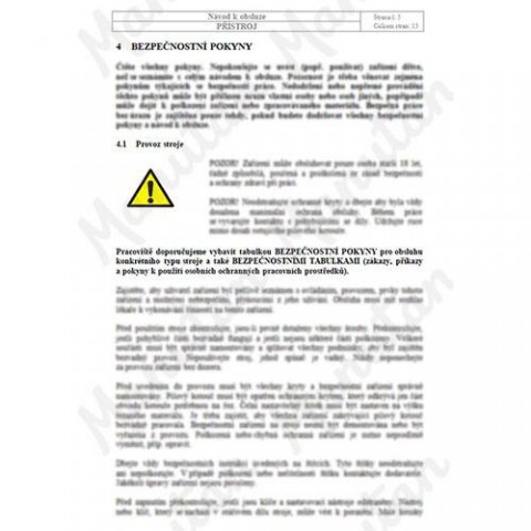 Bezpečnostní značka, tabulka nebo samolepka "Návod k obsluze" plně odpovídá požadavkům právních a technických předpisů, zejména Nařízení vlády č. 375/2017 Sb., ČSN ISO 3864-1, ČSN ISO 3864-2, ČSN ISO 3864-3, ČSN ISO 3864-4.Informační tabulka - Bruska pásových pil