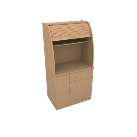 Kuchyně do kanceláří se dvěma policemi a plastovou roletou v požadovaném dezénu. dezén: buk, třešeň rozměry v x š x h: 180 x 90 x 60 cm materiál: laminovaná dřevotříska počet polic: 2 počet zásuvek: 1 ABS hrany, desky tloušťky 18 mm, vyrovnávací šrouby, dodáváno v demontovaném stavu (spojovací materiál součástí balení)Kancelářské kuchyňky