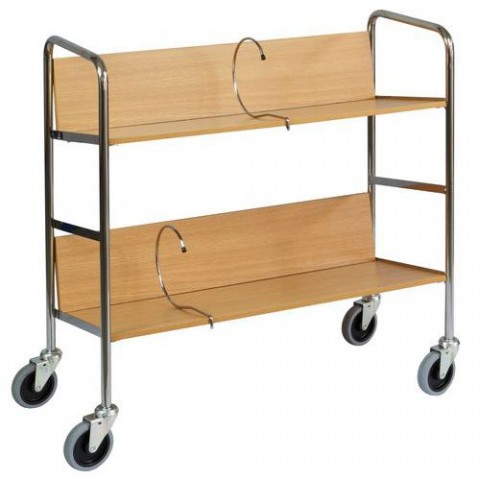 Dřevěný vozík se dvěma policemi vhodný do kanceláří pro rozvoz šanonů a dokumentů. Police z laminované dřevotřísky v barvě světlého dubu jsou opatřené opěrnou stěnou. Maximální nosnost na jednu polici je 30 kg a je na ní možné umístit až osm šanonů. Mobilitu zajišťují čtyři otočná kola s kluznými ložisky. Povrchová úprava chromováním. Na vyžádání je možné dodat vozík s policemi v dezénu třešeň.Kancelářský policový vozík Ergobjorn, do 60 kg, 2 police