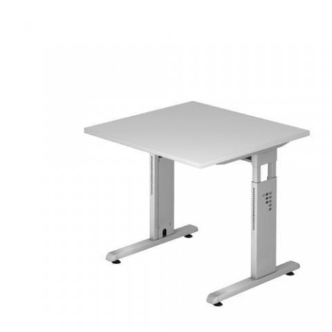 Výškově nastavitelný stůl ve světle šedé barvě. Nosná vzpěra pod deskou stolu slouží i jako kabelové vedení. barva desky: světle šedá rozměry desky d x h: 80 x 80 cm výška stolu: 65 - 85 cm (stavitelná) provedení: rovné materiál desky: laminovaná dřevotříska, tl. 25 mm materiál podnoží: kov barva podnoží: stříbrná RAL 9006 2mm ABS hrana, vyrovnávací šrouby, dodáváno v demontovaném stavu (spojovací materiál součástí balení)Kancelářský stůl Baron Minos, 80 x 80 x 65 - 85 cm, rovné provedení