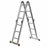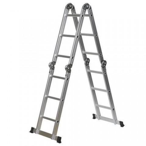 Kloubový hliníkový žebřík ze čtyř dílů po třech příčkách, vhodný pro profesionální použití. Možnost sestavení jako opěrný žebřík, stojací štafle nebo lešení. Pracovní výška lešení je 2,85 m; štaflí 3,1 m a opěrného žebříku 4,5 m. Celková výška lešení je 0,95 m; štaflí 1,8 m a opěrného žebříku 3,7 m. Nosnost lešení je 105 kg, v pozici štaflí nebo opěrného žebříku 150 kg. Žebřík je opatřen ochrannými patkami.Kloubový hliníkový žebřík, 4 x 3 příčky