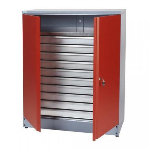 Kovová skříň s jednou policí a s deseti zásuvkami. Dveře jsou pro větší bezpečnost vyztuženy profilovanými výztuhami. Je uzamykatelná tříbodovým rozvorovým mechanismem. Dodáváno v demontovaném stavu se spojovacím materiálem. rozměry v x š x h: 110 x 91 x 45 cm materiál: ocelový plech tl. 1 mm nosnost na polici: 75 kg nosnost zásuvky: 30 kg počet polic: 1 ks počet zásuvek: 10 ks výška zásuvky: 7 cm výsuv zásuvek: 100 % barva: stříbrná barva dveří: červená RAL 3002 hmotnost: 91 kg povrchová úprava pozinkováním, možnost uzamčení (cylindrický zámek),dodáváno v demontovaném stavu (spojovací materiál součástí balení)Kovová dílenská skříň, 110 x 91 x 45 cm