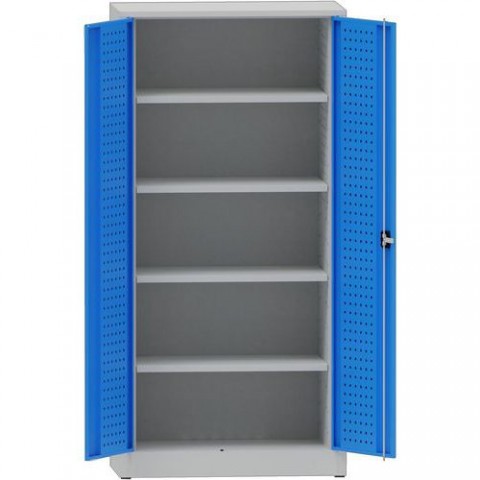 Kovová dílenská skříň se čtyřmi výškově nastavitelnými policemi. Skříň je možné uzamknout dvoubodovým cylindrickým zámkem. Robustní konstrukce je svařována z ocelového plechu. Dveře skříně jsou perforované.Kovová dílenská skříň, 195 x 95 x 50 cm