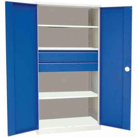 Dílenská skříň vhodná pro uložení pracovních nástrojů a pomůcek. Skříň je vybavena třemi výškově stavitelnými policemi a dvěma zásuvkami. Police i zásuvky jsou přestavitelné v rastru 20 mm. Zásuvky jsou umístěny na kuličkových výsuvech. Vyrobena z plechu tl. 0,9 mm.Kovová dílenská skříň Manutan Expert, 195 x 100 x 45 cm