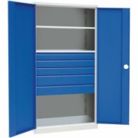 Dílenská skříň vhodná pro uložení pracovních nástrojů a pomůcek. Skříň je vybavena dvěmi výškově stavitelnými policemi a pěti zásuvkami s výškou 87, 109 a 155 mm. Police i zásuvky jsou přestavitelné v rastru 20 mm. Zásuvky jsou umístěny na kuličkových výsuvech.Kovová dílenská skříň, 195 x 100 x 45 cm, 5 zásuvek - Manutan Expert