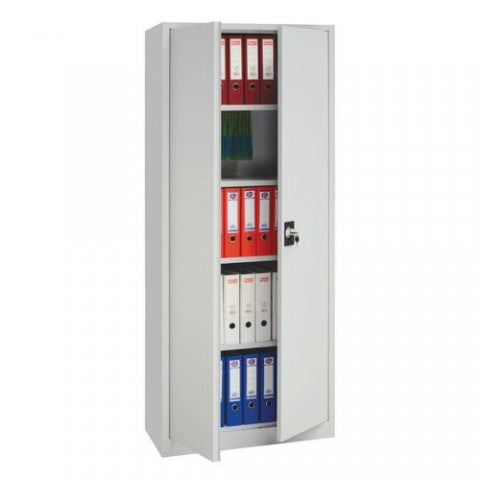 Montovaná skříň se stabilní konstrukcí vhodná pro uložení 75 pořadačů. Vyztužené křídlové dveře lze otevírat až do 180°. Zamykání pákovým rozvorovým mechanismem Ronis. Police mají upravený lem pro podvěšení závěsných složek formátu A4.Kovová spisová skříň, 4 police, 195 x 120 x 42,2 cm