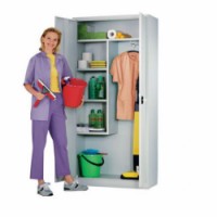 Svařovaná kovová skříň pro uskladnění úklidových potřeb. Součástí skříně je tyč na ramínka. Nosnost police: horní 40 kg, ostatní 20 kg. Uzamykání pomocí cylindrického zámku se dvěma klíči. Povrchová úprava práškovou barvou.Kovová úklidová skříň, 195 x 95 x 40 cm