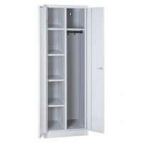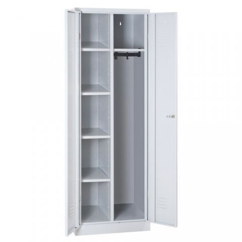 Úklidová uzamykatelná skříň ze svařovaného ocelového plechu. Větrací otvory v horní a dolní částí dvířek. Skříň je dělená na dva oddíly, z nichž jeden je se čtyřmi policemi, druhý obsahuje jednu vrchní polici a tyč s odkládacími háčky. Dvířka jsou zavěšená na vnitřních pantech. Možnost umístění štítku se jménem v horní části dveří.Kovová úklidová skříň, 5 polic, 180 x 60 x 50 cm - Manutan Expert