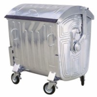 Kovový venkovní kontejner se dvěma bržděnými koly, opatřený gumou zabraňující šíření zápachu a vypouštěcím otvorem na dně nádoby.Kovová venkovní popelnice, objem 1 100 l