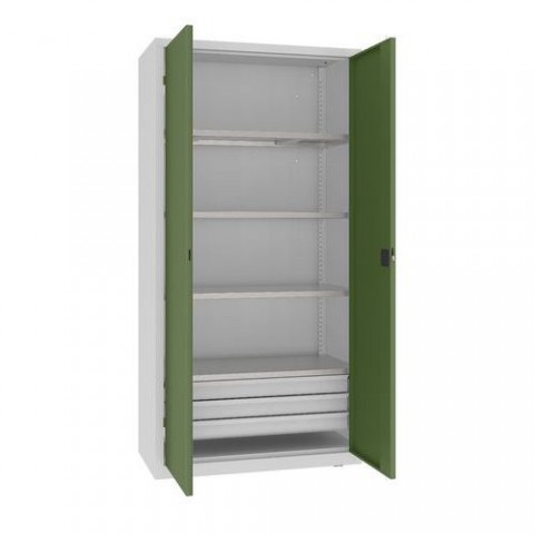 Dílenské kovové skříně se třemi zásuvkami a čtyřmi policemi vhodné pro profesionální použití ve vnitřních suchých a větraných prostorách. Monolitická svařovaná konstrukce z oceli tl. 1 mm zajišťuje vysokou pevnost. Křídlové dveře s tříbodovým zámkem RONIS (dodáváno se 2 klíči). Vyrovnávací nožky, které jsou nastavitelné zevnitř. Posuvníky pro snadný pohyb skříně a ochranu podlahy. Pro vysokou bezpečnost lze přikotvit ke zdi. Před lakováním jsou skříně potaženy zirkoniovou vrstvou, která je chrání před korozí a zvyšuje přilnavost laku. Skříně jsou opatřené nátěrem, který má klasifikaci reakce na oheň: A2-s1, d0 dle norem PN-EN 13501-1:2019-02. Vyráběno v souladu s normami ISO:9001 a ISO:14001.Kovové dílenské skříně, 199 x 100 x 50 cm, 3 zásuvky