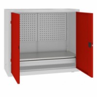 Kovové nízké skříňky pro uložení dílenského nářadí. Vybavené perforovaným panelem, na který lze umístit držáky nářadí a materiálu (nejsou součástí balení). Zásuvka a nastavitelná pozinkovaná police v rastru 25 mm. Monolitická svařovaná konstrukce z oceli tl. 1 mm zajišťuje vysokou pevnost. Vhodné pro profesionální použití ve vnitřních suchých a větraných prostorách. Křídlové dveře s tříbodovým zámkem RONIS (dodáváno se 2 klíči). Vyrovnávací nožky, které jsou nastavitelné zevnitř. Posuvníky pro snadný pohyb skříně a ochranu podlahy. Pro vysokou bezpečnost lze přikotvit ke zdi. Před lakováním jsou skříně potaženy zirkoniovou vrstvou, která je chrání před korozí a zvyšuje přilnavost laku. Skříně jsou opatřené nátěrem, který má klasifikaci reakce na oheň: A2-s1, d0 dle norem PN-EN 13501-1:2019-02. Vyráběno v souladu s normami ISO:9001 a ISO:14001.Kovové dílenské skříně s perfopanelem, 104 x 120 x 50 cm, 1 zásuvka
