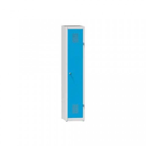 Základní provedení dostupné ve třech výškách – 1200, 1500 a 1850 mm. Variantami jsou skříně jednodvéřové, dvoudvéřové a třídvéřové. Šatníky jsou standardně vybaveny cylindrickým zámkem, dvěma klíči a třemi plastovými háčky. Plechová šatní skříň převážně pro základní školy. Dveře jsou celoplošně vyztužené a pevné v krutu a ohybu. Dveře jsou zavěšeny na kovových pantech originální konstrukce s úhlem otevření 180°. Police ve spodní části skříňky. Cylindrický zámek se dvěma klíči.Kovové šatní skříně 1-dvířkové na soklu, 300 x 500 x 1500 mm