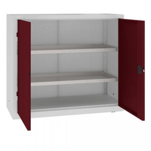 Kovové svařované skříně s vanovými policemi vhodné pro skladování kapalin. Monolitická svařovaná konstrukce z oceli tl. 1 mm zajišťuje vysokou pevnost. Vhodné pro profesionální použití ve vnitřních suchých a větraných prostorách. 2 retenční pozinkované police s nosností 60 kg. Křídlové dveře s tříbodovým zámkem RONIS (dodáváno se 2 klíči). Vyrovnávací nožky, které jsou nastavitelné zevnitř. Posuvníky pro snadný pohyb skříně a ochranu podlahy. Pro vysokou bezpečnost lze přikotvit ke zdi. Před lakováním jsou skříně potaženy zirkoniovou vrstvou, která je chrání před korozí a zvyšuje přilnavost laku. Skříně jsou opatřené nátěrem, který má klasifikaci reakce na oheň: A2-s1, d0 dle norem PN-EN 13501-1:2019-02. Vyráběno v souladu s normami ISO:9001 a ISO:14001.Kovové skříně s vanovými policemi, 104 x 120 x 50 cm
