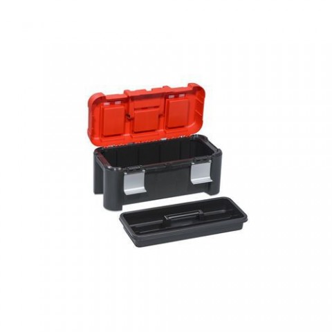 Kufr na nářadí z odolného plastu s vyjímatelnou miskou s přihrádkami. Pevné uzavíratelné zásobníky na drobný materiál na víku kufru. Hliníkové uzavírací klipy a rukojeť, protiskluzové patky.Kufr na nářadí Allit McPlus Alu 21
