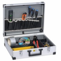 Hliníkový kufřík na nářadí s variabilními plastovými přihrádkami a textilními kapsami v horním víku kufru. Uzavíratelný pomocí kovových klipsů.Kufr na nářadí AluPlus Tool L 44-1