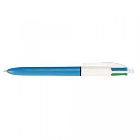 Kuličkové pero se 4 barvami inkoustu - červená, modrá, zelená a černá. Nadčasový design pera. Snadno se zasune jediným stisknutím. Středně zúžený hrot pro hladké a úhledné psaní. S klipem pro připevnění na oblečení, kapsy nebo psací plochy. Vyrobeno ve Francii.Kuličkové pero Bic Blue, mix barev, 4 náplně
